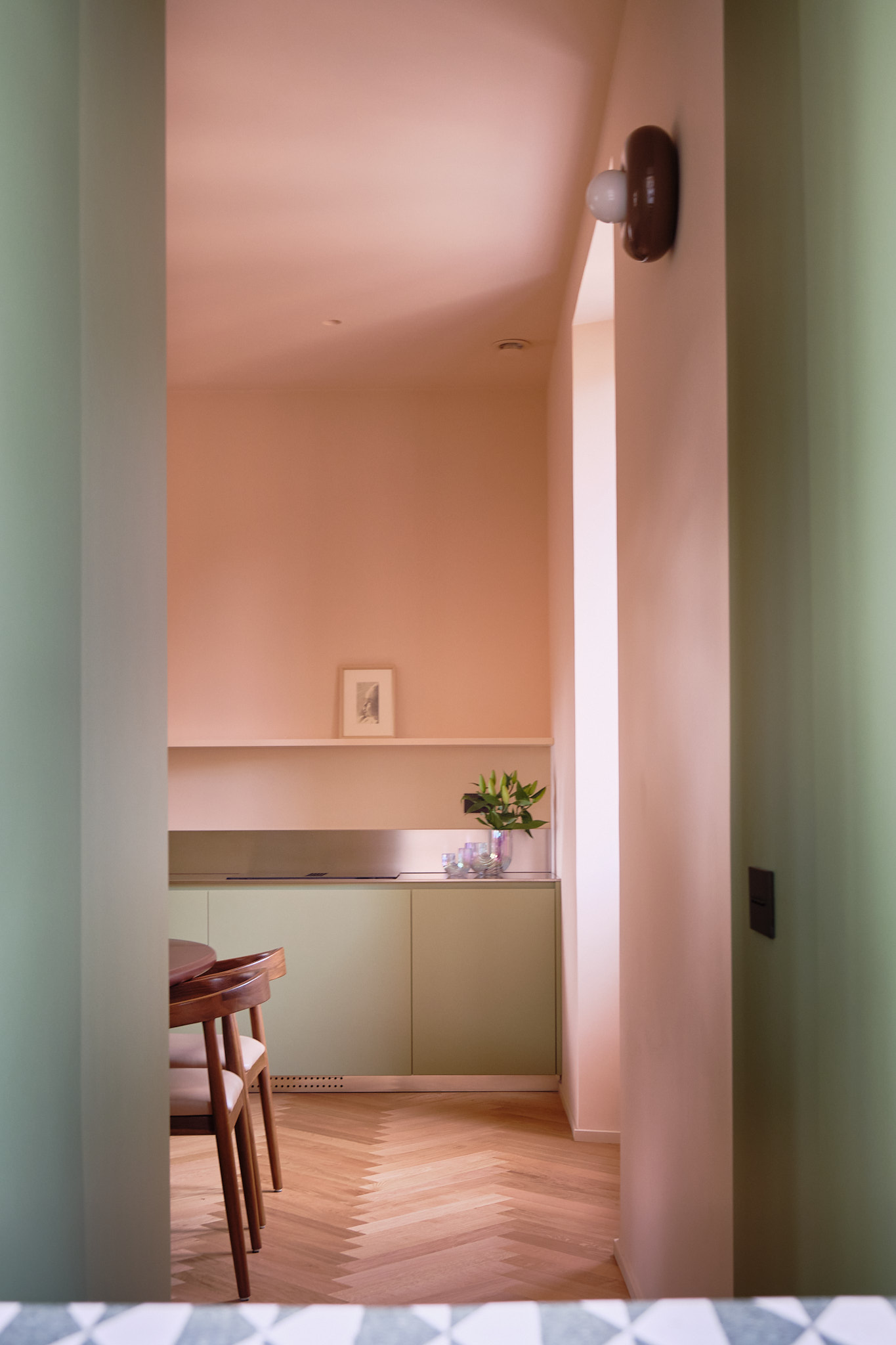 The island is a solid volume in marble used both on the countertop and cabinet doors, where the veins of the stone define the geometry of the shapes and soften the dark tone by adding light-toned nuances. The sink at one end of the island, slightly elevated from the countertop, is the only element that creates movement and breaks the linearity.