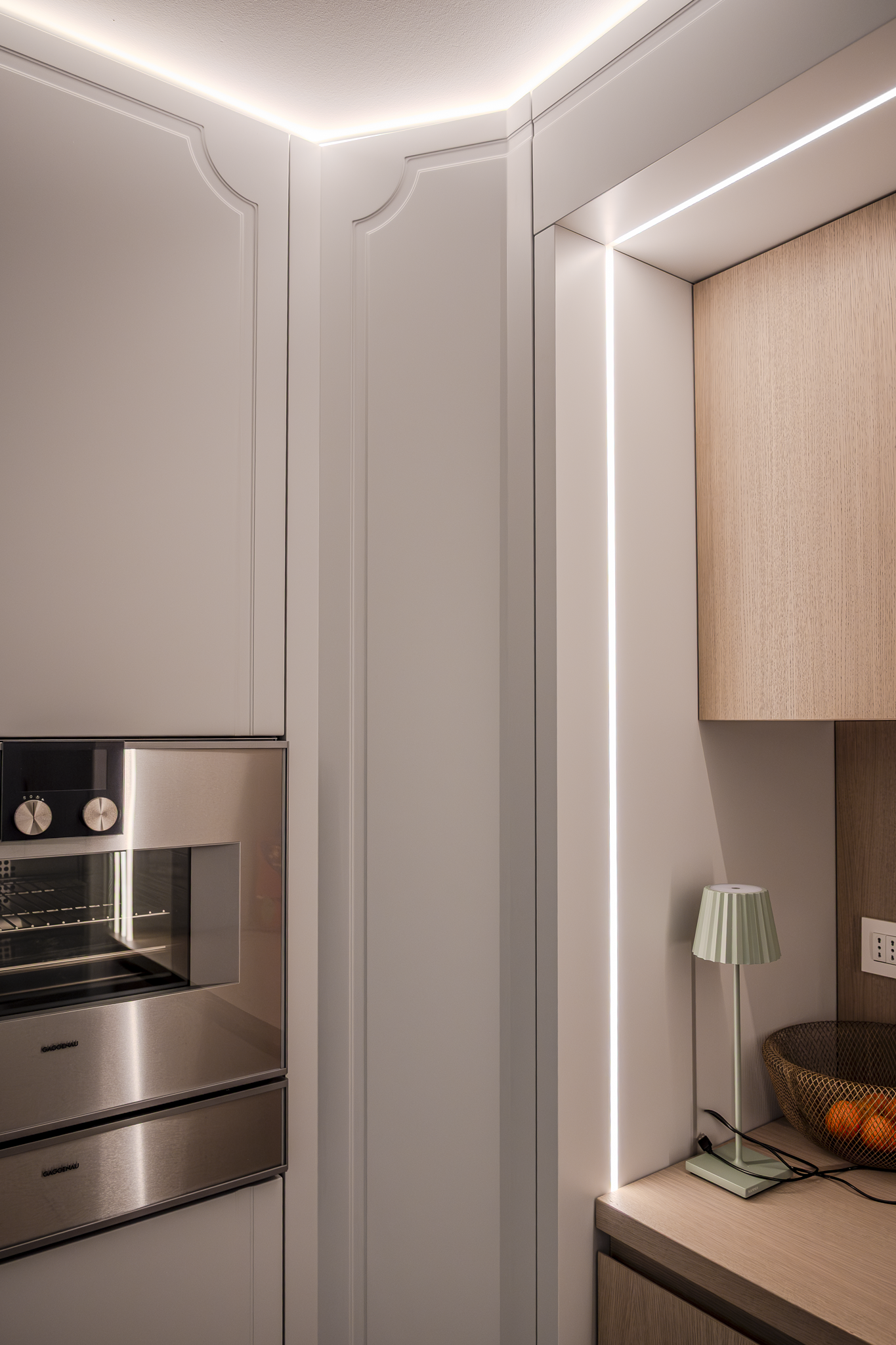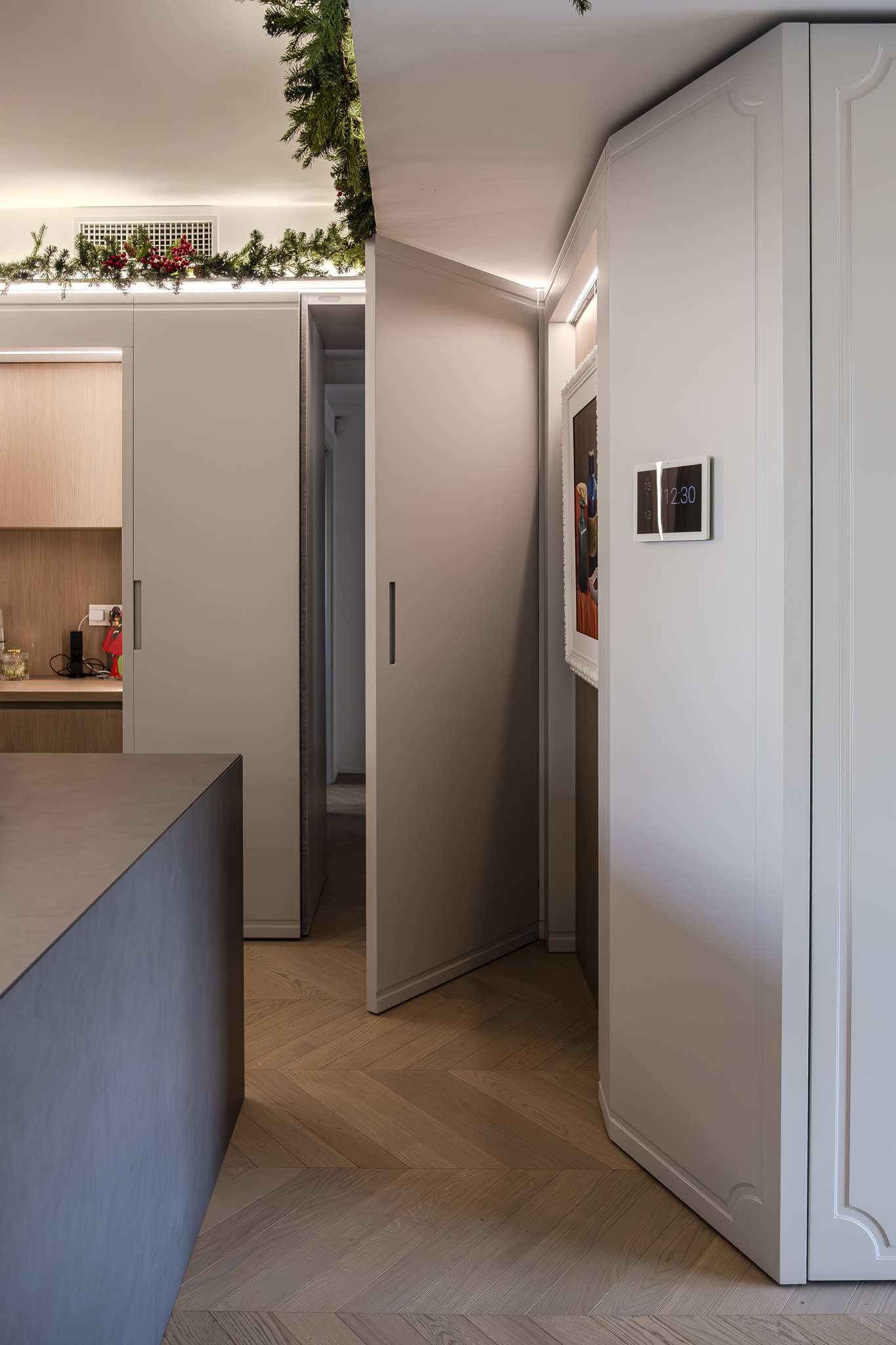 The true architectural heart of the project is the full-height boiserie; here, the walls do not merely define the space, they whisper to it. This bespoke paneling wraps the kitchen and living room in absolute continuity, covering the walls of both spaces. More than a simple cladding, it is a work of extreme artisanal precision. The doors and panels feature subtle geometric millings that create a highly refined interplay of shadows and volumes, lending rhythm to the surfaces without weighing them down. For the finish, a sophisticated powder blue (carta da zucchero) lacquer was chosen. This dusty, timeless hue instills a calm and relaxed atmosphere, serving as the perfect chromatic counterpoint to the warmth of the wood and the technical rigor of the appliances.