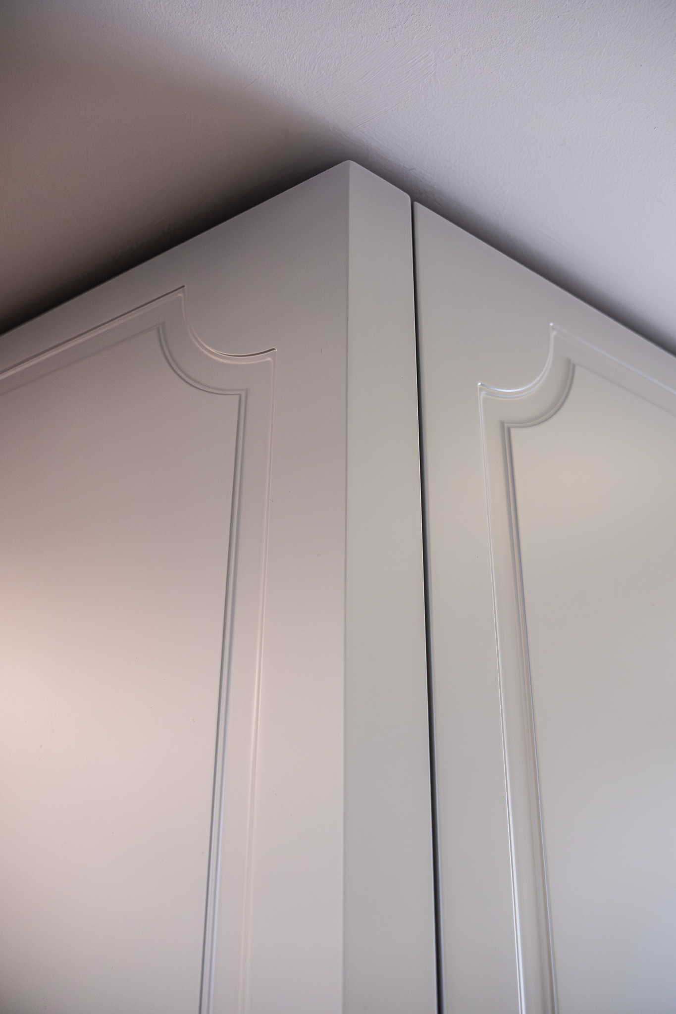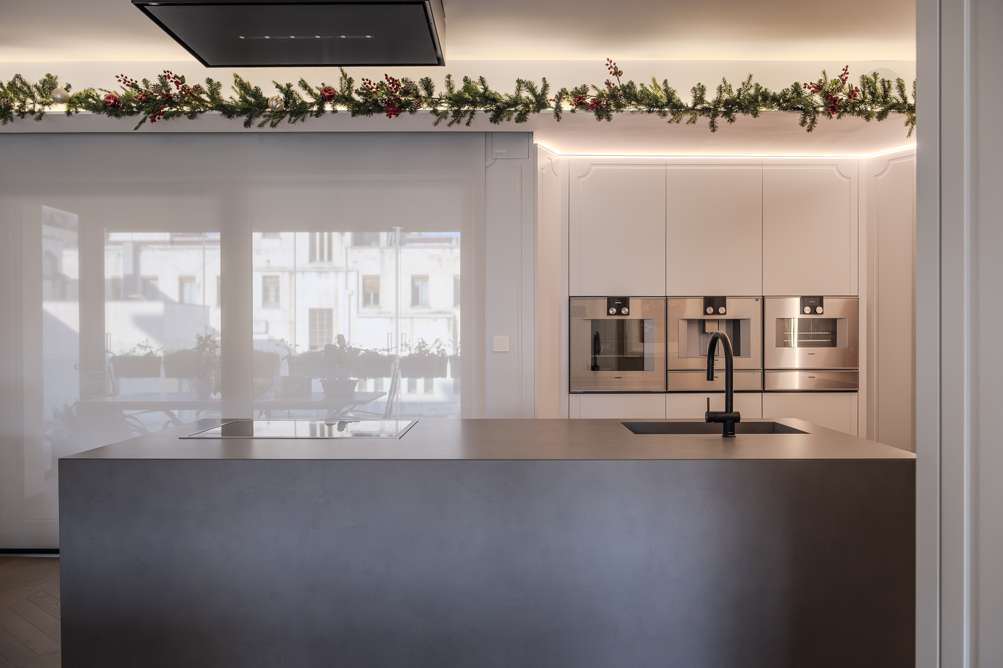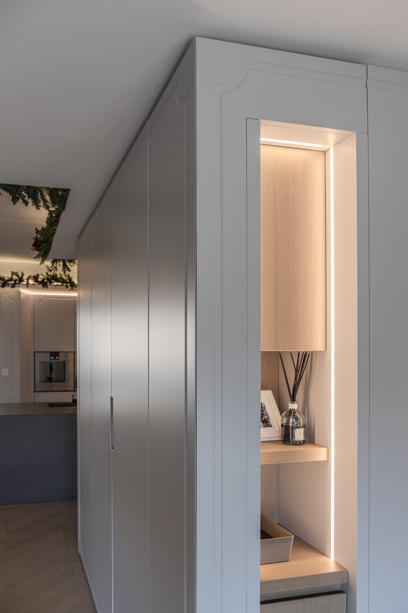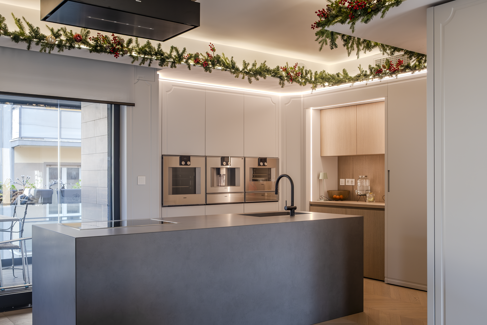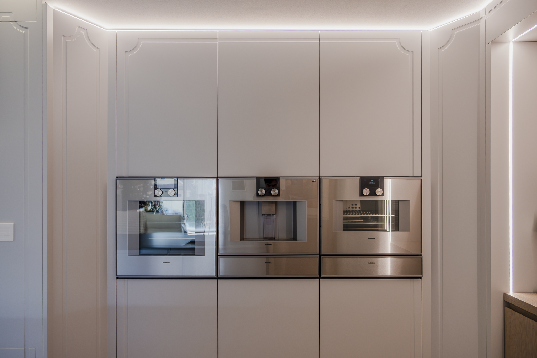 The open shelving within the tall units reveals a warm, natural soul. The use of wood essence, visible in the functional niches and open compartments, creates a material contrast with the lacquered boiserie. This detail is not merely aesthetic: the vertical grain of the wood adds visual depth and evokes the prestige of natural materials typical of the Pittori 1931 philosophy, transforming the work area into a corner of welcoming design. The kitchen is equipped with Gaggenau appliances, a synonym for professional performance and avant-garde design.