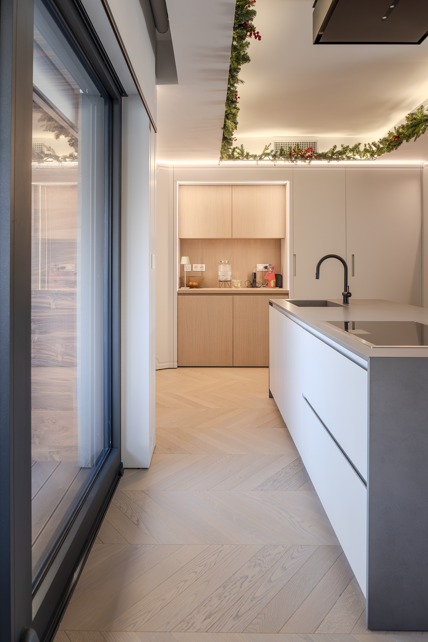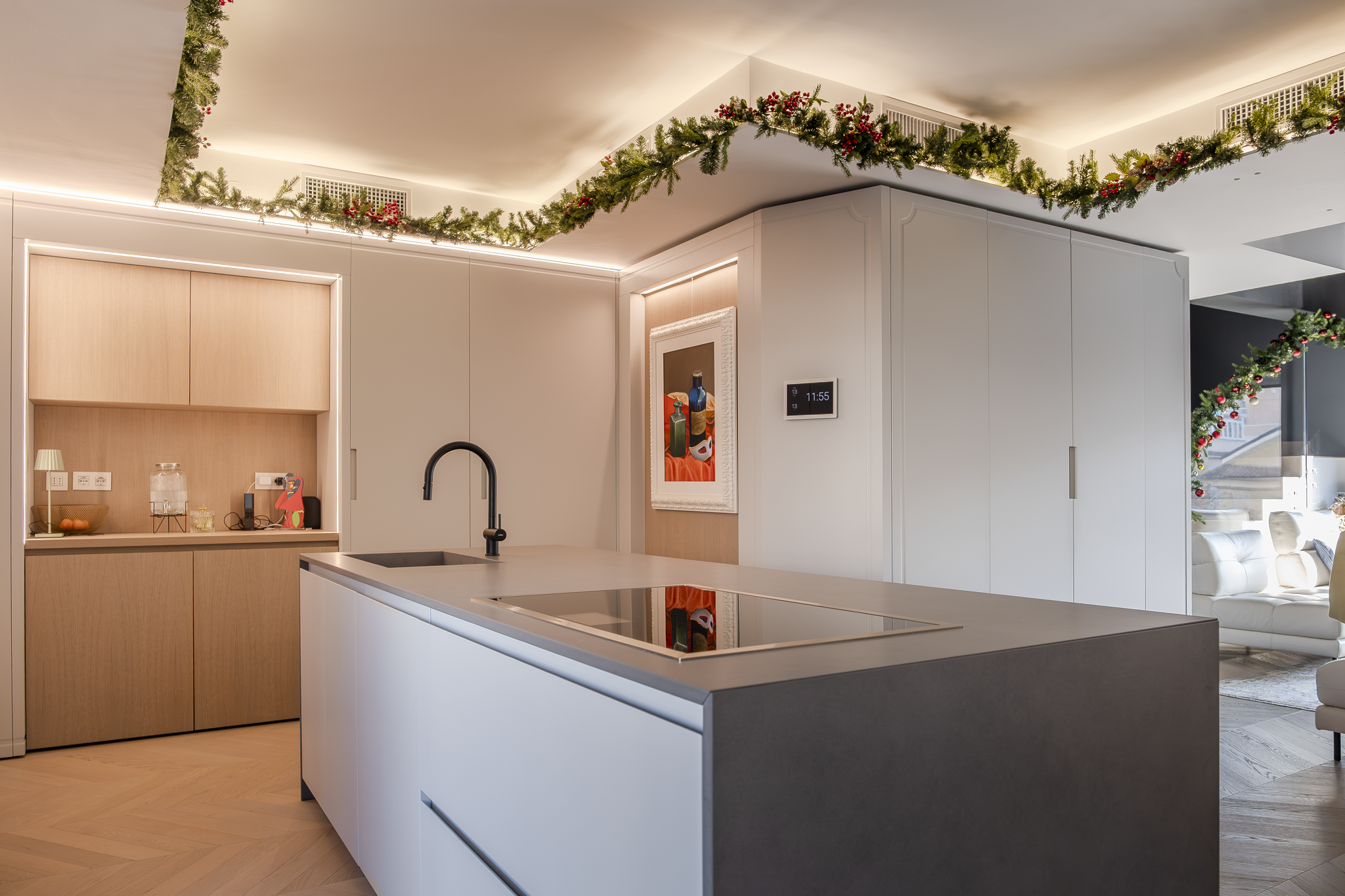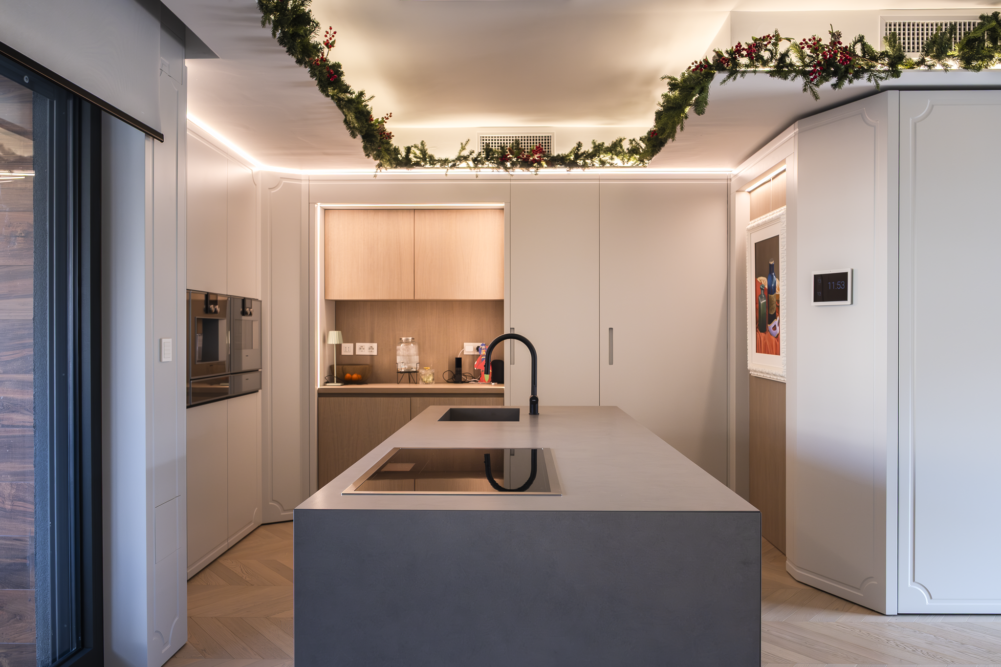 In this creation, designed to embrace daily gestures with timeless elegance, the kitchen and living areas merge into a single tactile narrative, where woodworking tradition meets the formal purity of contemporary design.