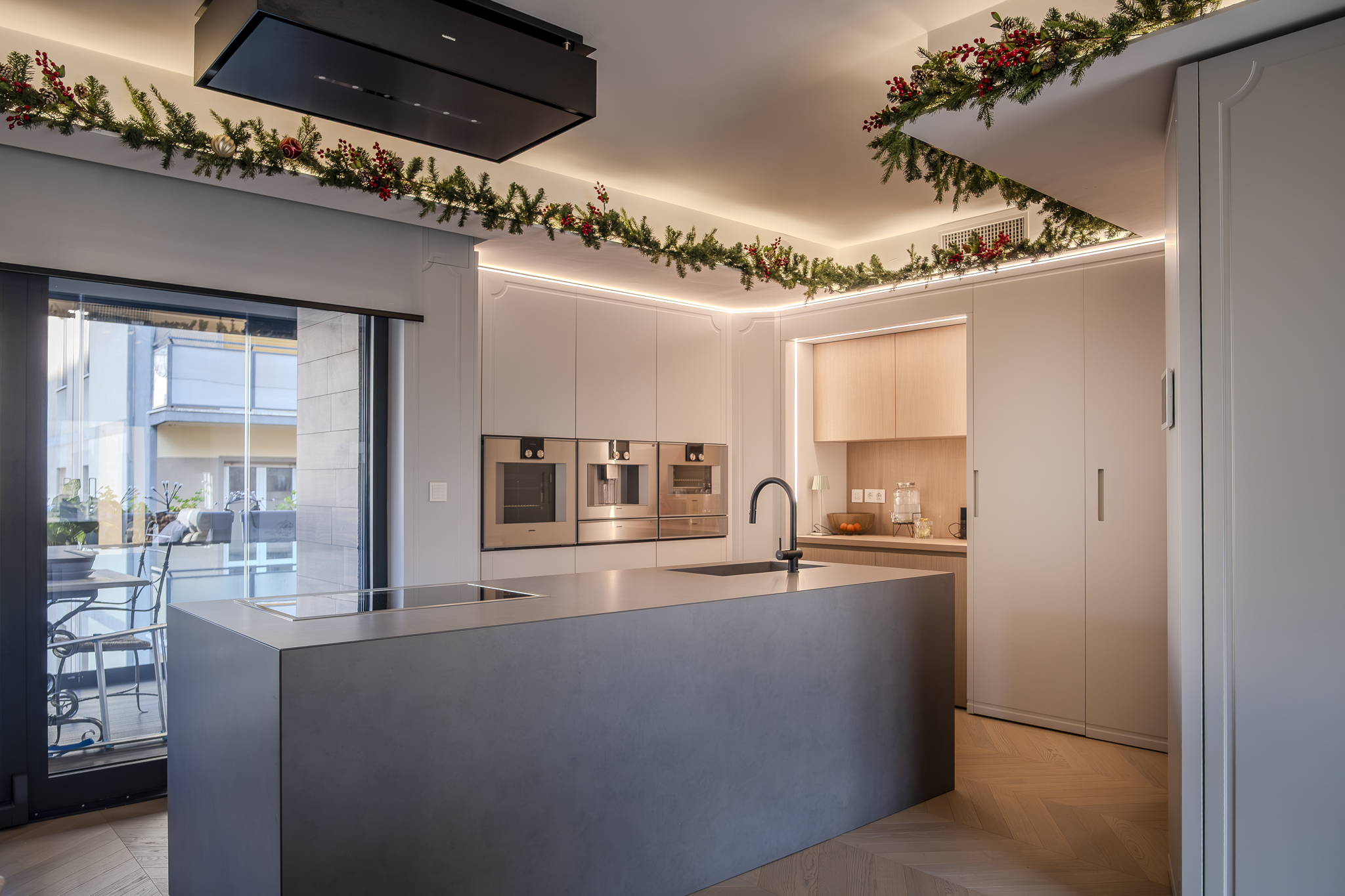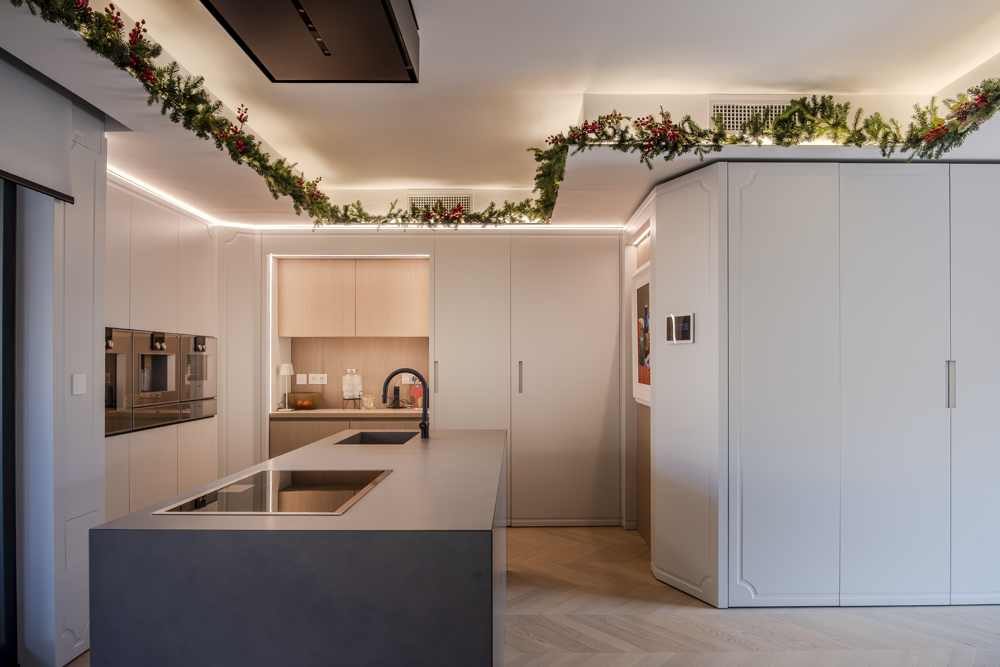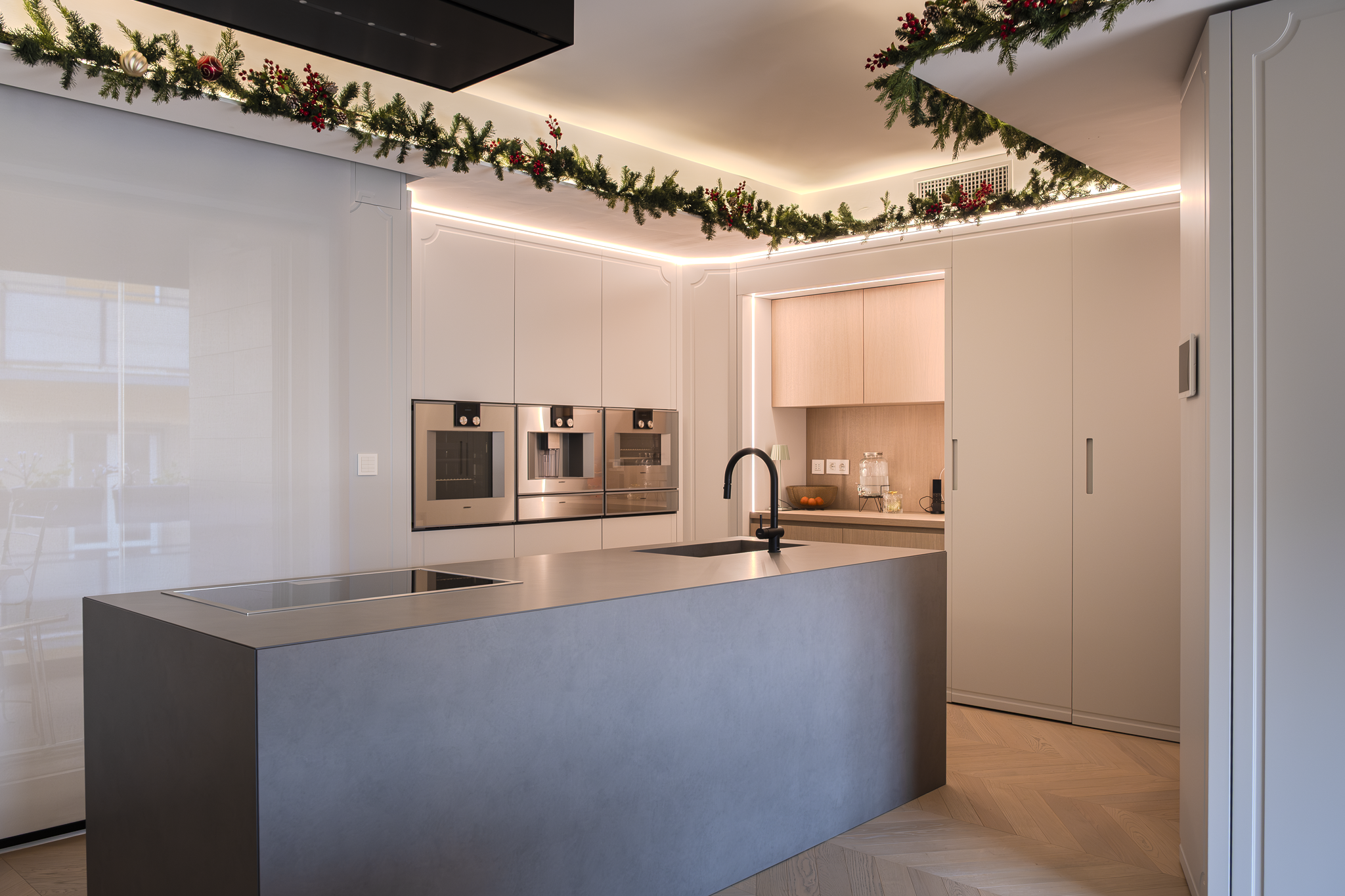 In this creation, designed to embrace daily gestures with timeless elegance, the kitchen and living areas merge into a single tactile narrative, where woodworking tradition meets the formal purity of contemporary design.