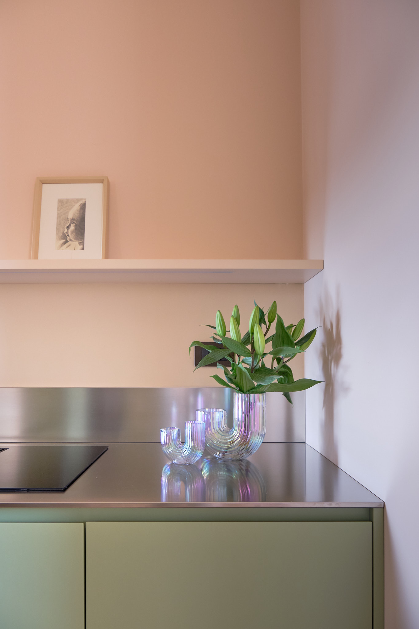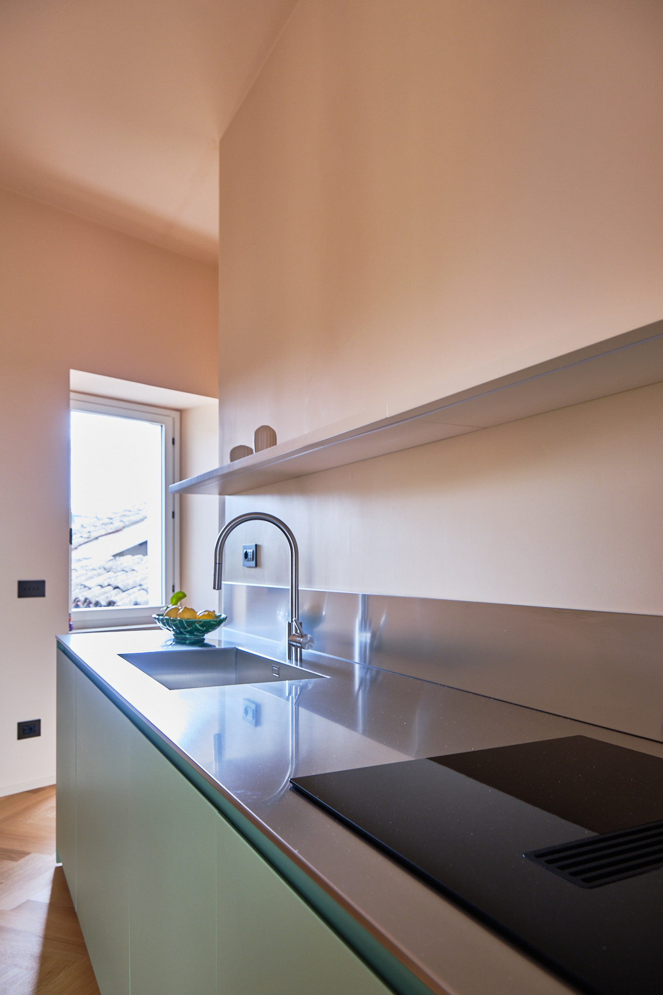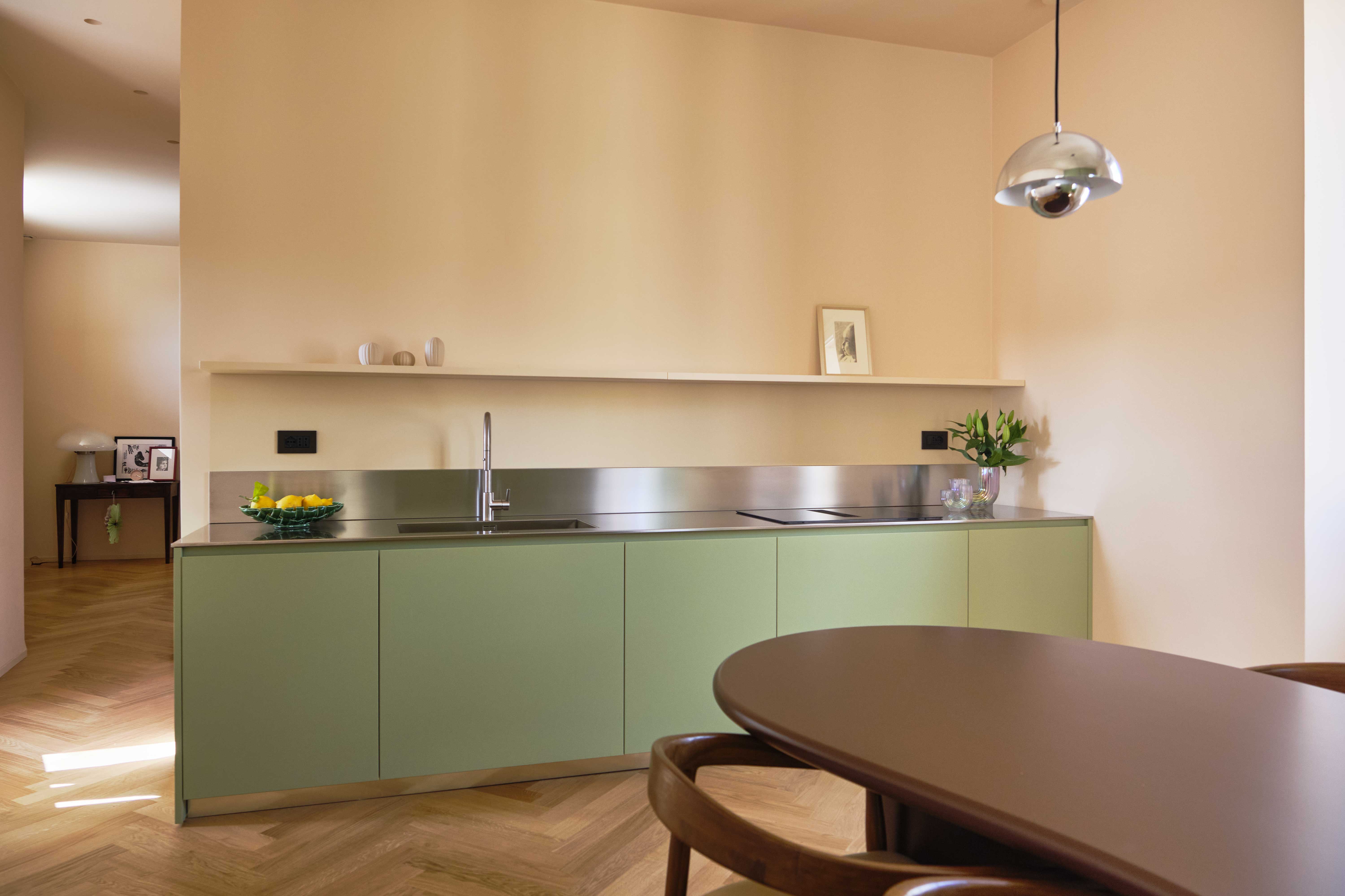 Il piano in acciaio inox brilla con discrezione, riflettendo la luce e donando un tocco professionale a un ambiente che rimane comunque domestico e caloroso. Le ante laccate, lisce e sofisticate, accompagnano lo sguardo con continuità, sottolineando la purezza di un design che non ha bisogno di eccessi.