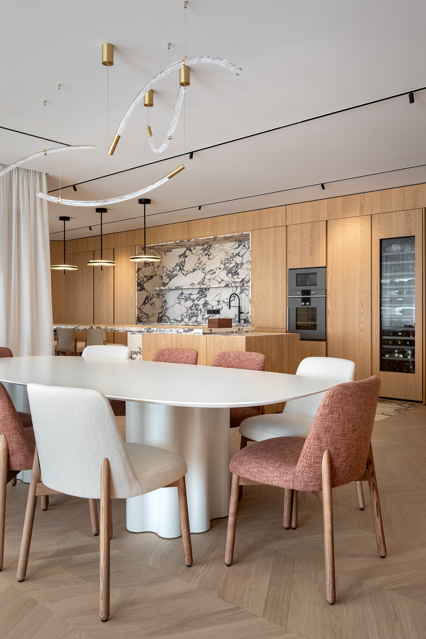In questa realizzazione, la cucina smette di essere un ambiente di servizio per diventare il cuore pulsante dell'abitare. Il concetto di involucro è qui espresso attraverso una boiserie in rovere che riveste interamente le pareti, creando una continuità cromatica e materica senza interruzioni tra la zona kitchen e il living.