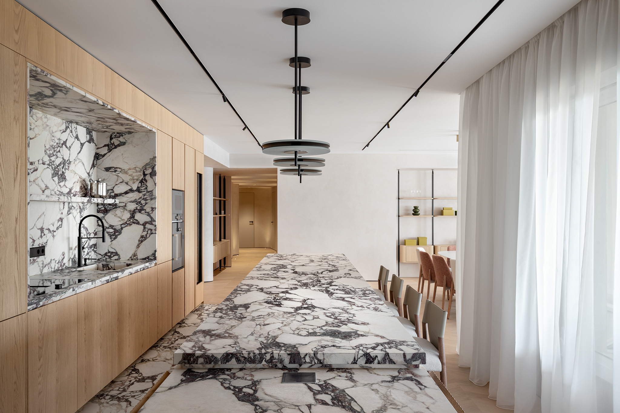 Il Top a Sbalzo: Una monumentale superficie in Calacatta Viola che si estende con uno sbalzo di 3 metri, trasformandosi in un tavolo conviviale di estrema leggerezza formale.