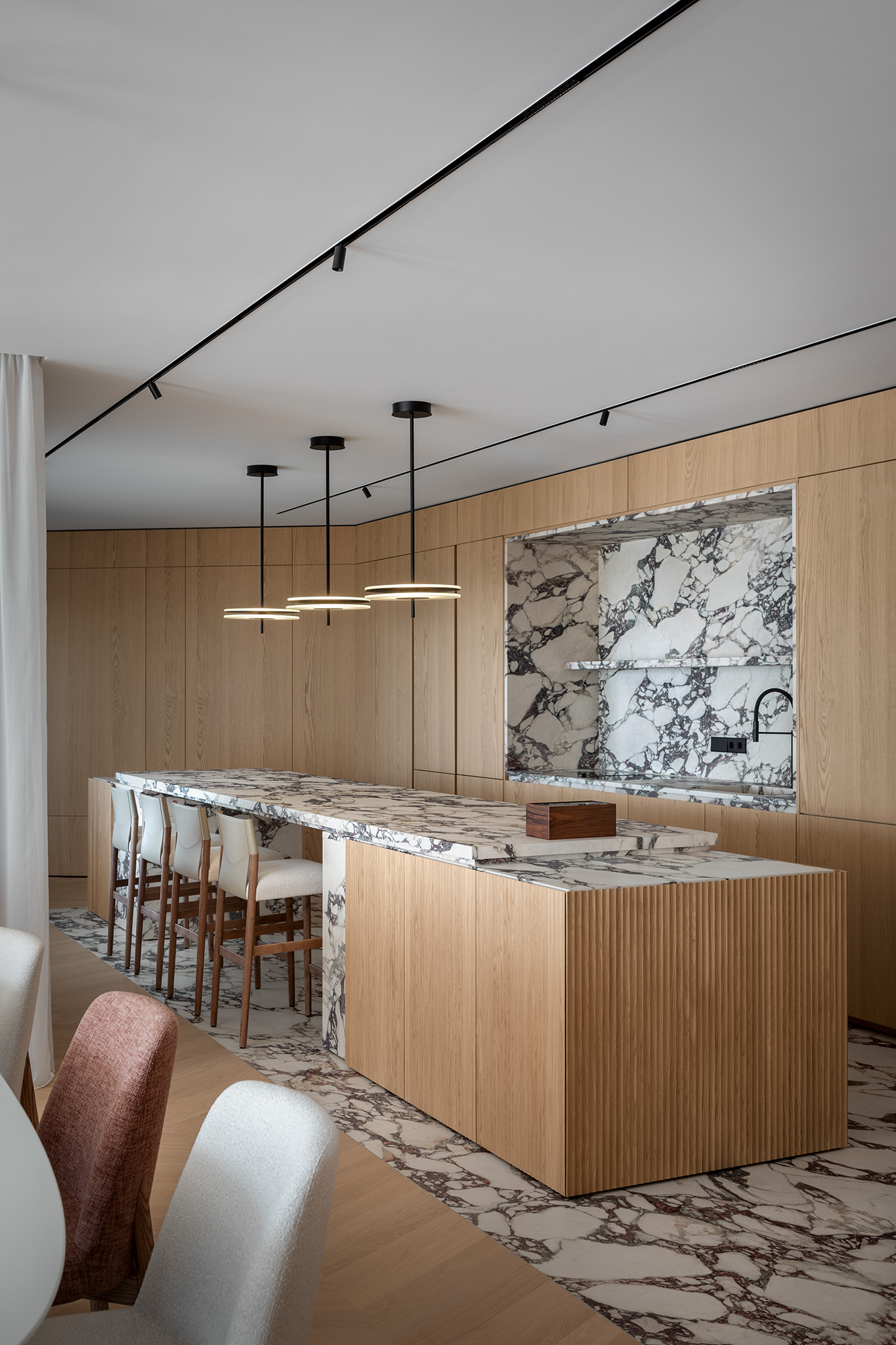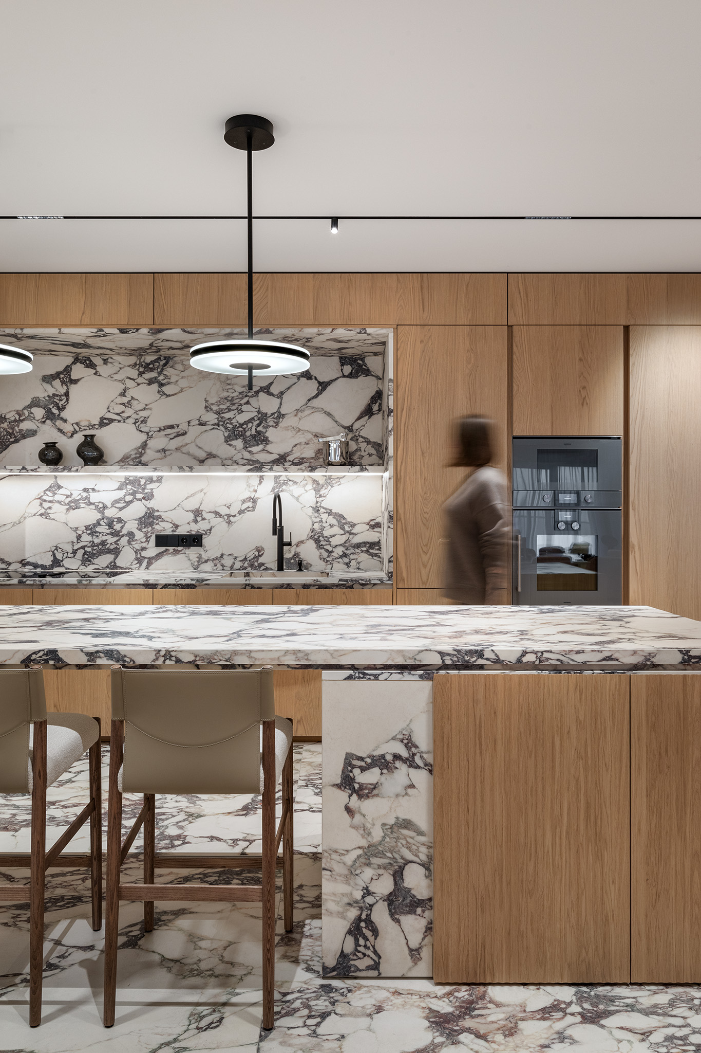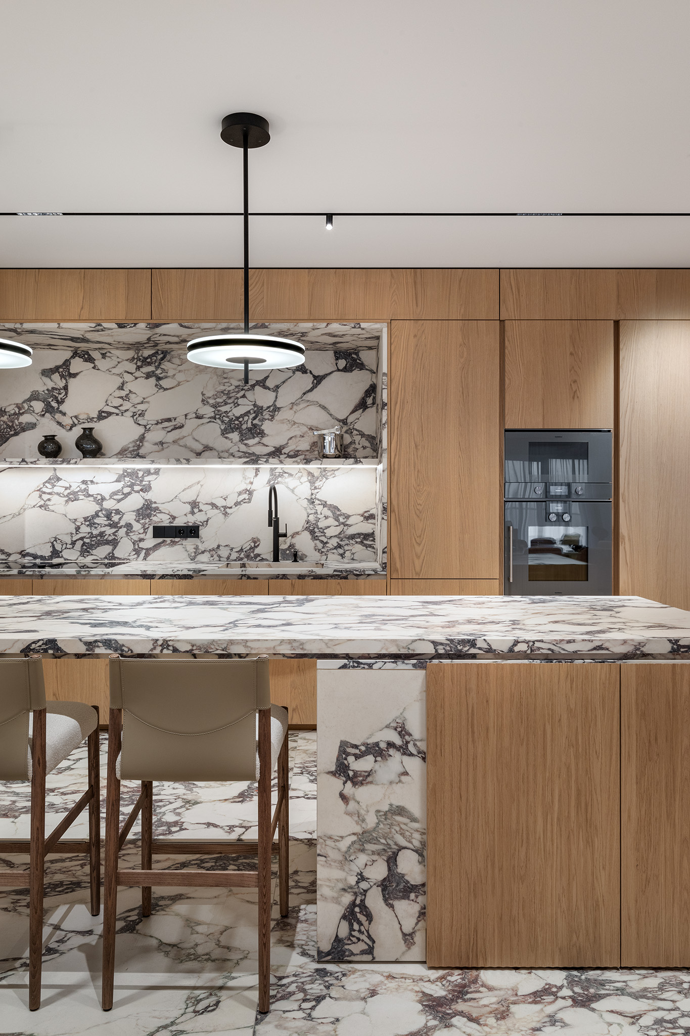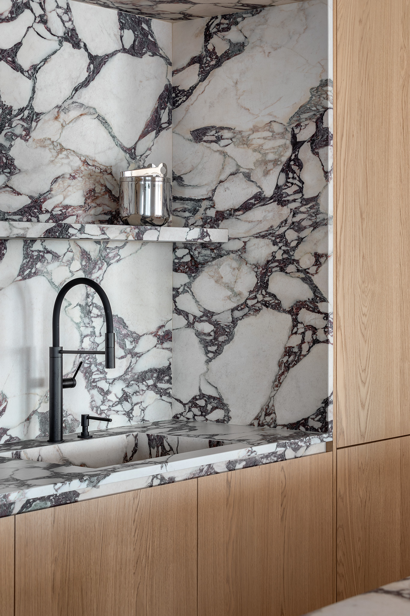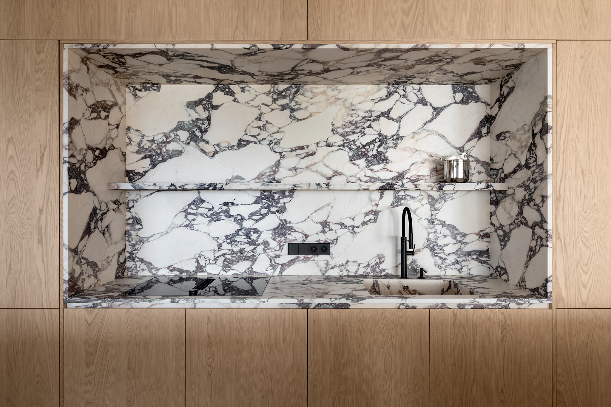 Contrasto Materico: Il Calacatta Viola, utilizzato anche per il pavimento e lo schienale del vano operativo, dialoga con il calore del rovere in un gioco di contrasti tra la freddezza del Calacatta Viola e la morbidezza del legno.