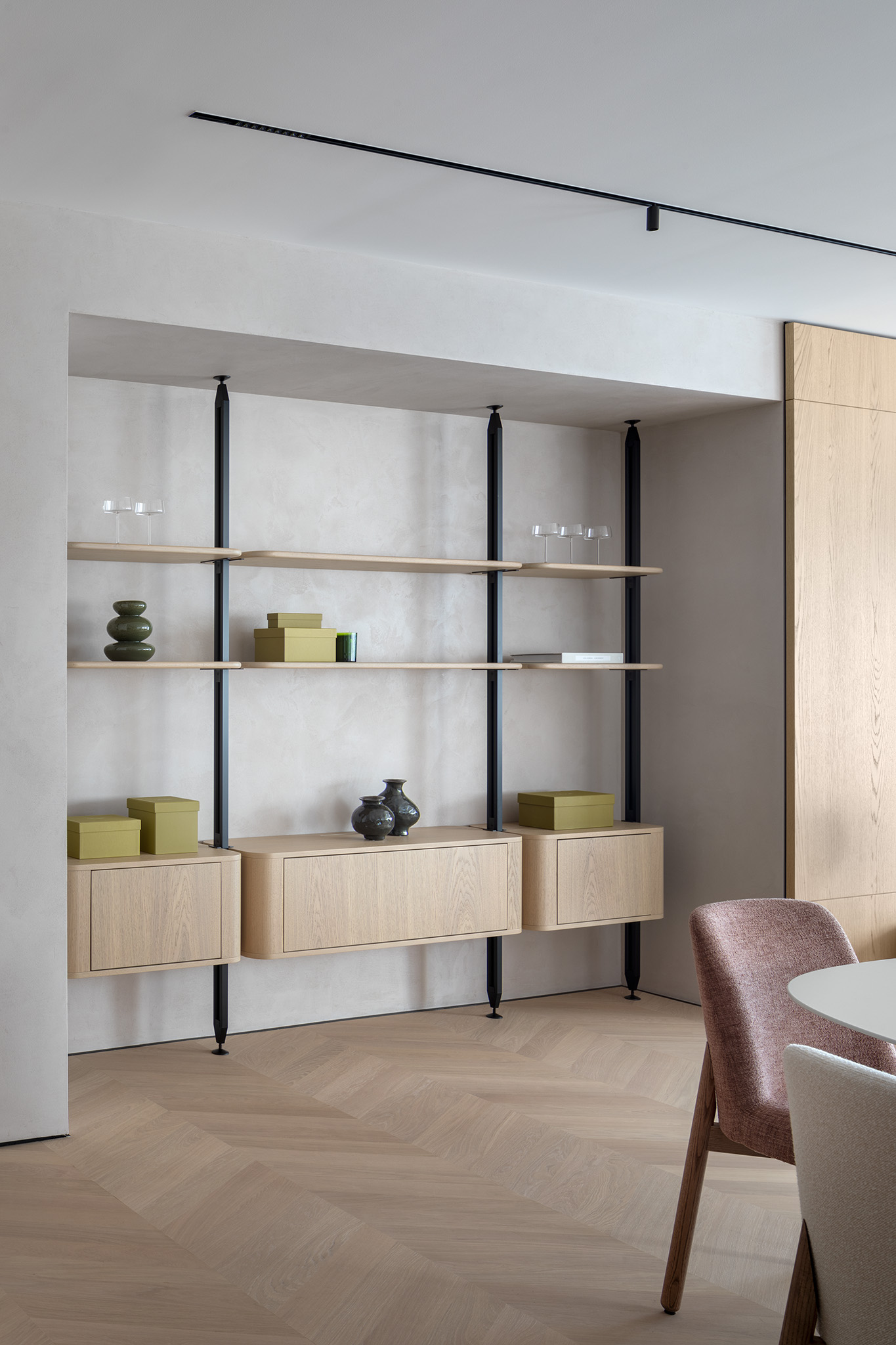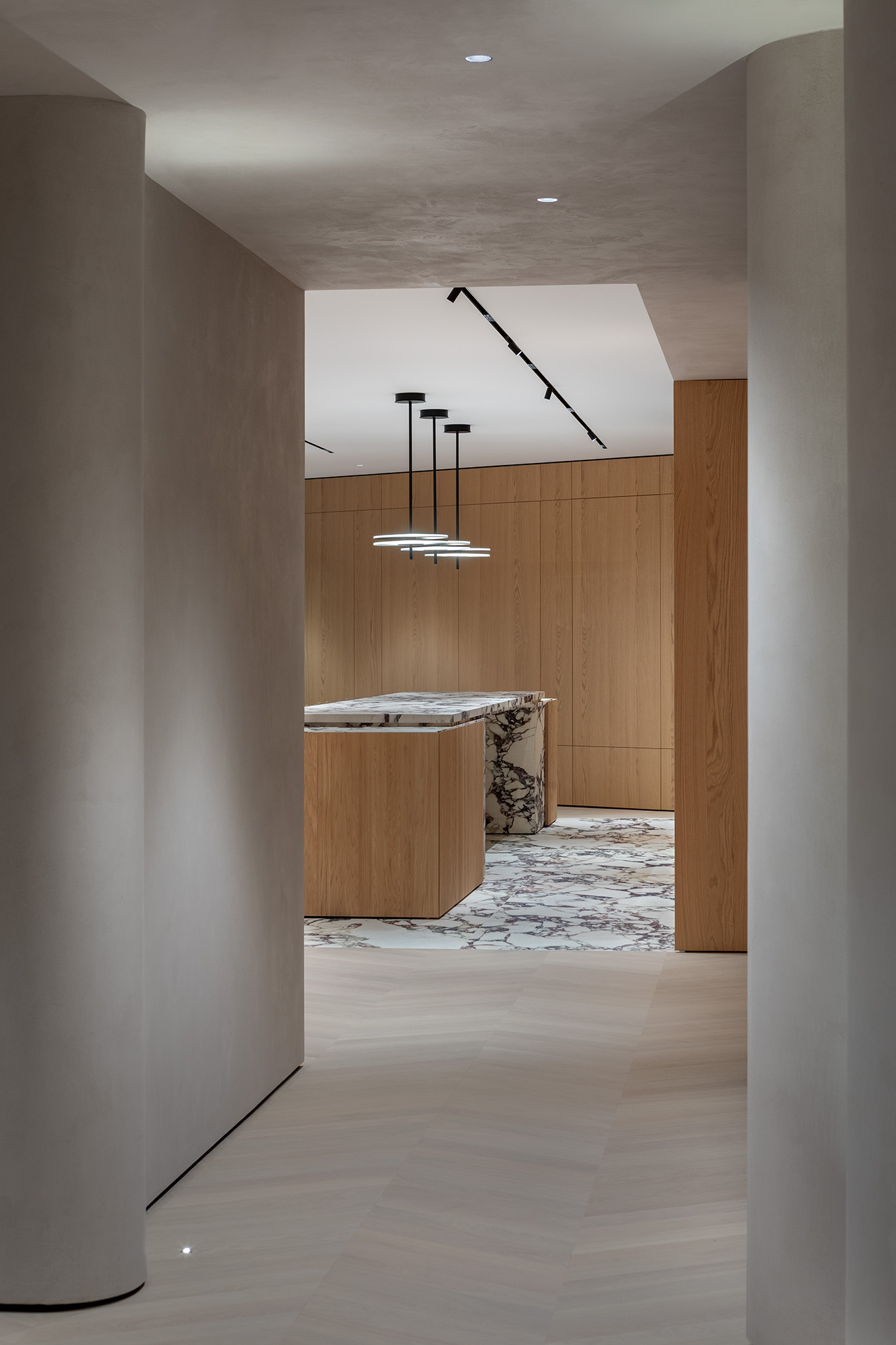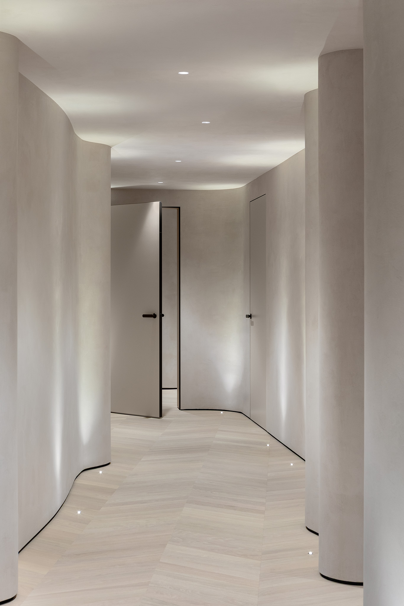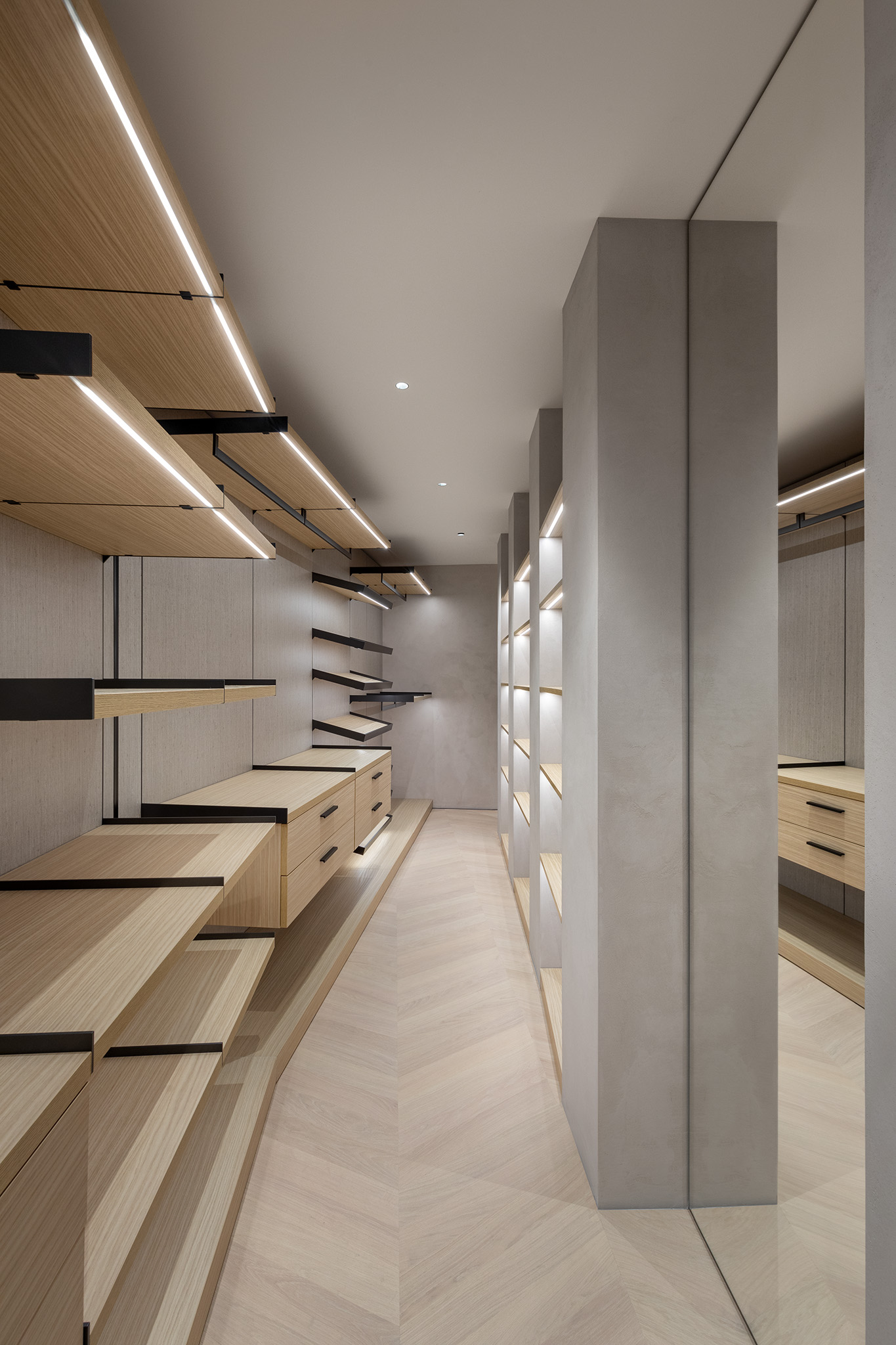 Le venature naturali del legno avvolgono lo spazio, nascondendo con precisione millimetrica ampie armadiature e passaggi, trasformando le superfici verticali in un volume architettonico puro e armonioso.